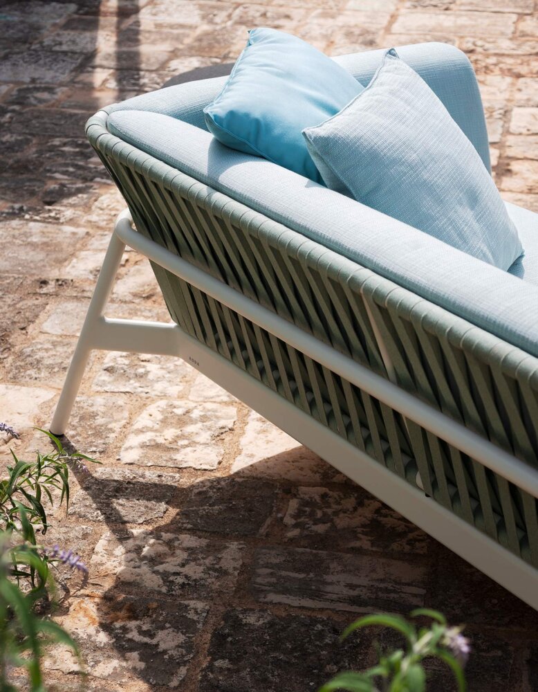 The padded tubular backrest variant, enveloping and understated, is complemented by the rope version, available in a wide palette of tones.