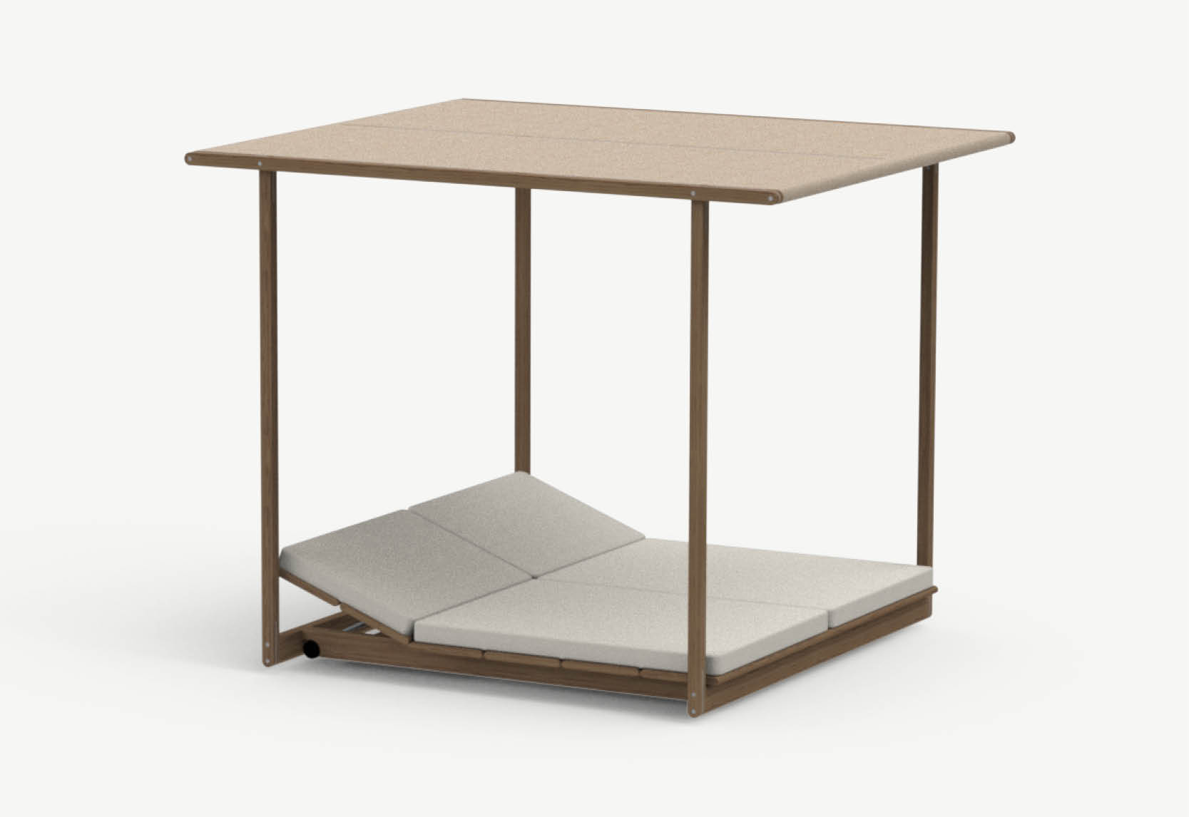 EOLIE es una colección outdoor con un diseño refinado, preciso y esencial. Como un archipiélago de elementos, diseñados y desarrollados en torno a la combinación de una ancha lámina de madera de iroko.