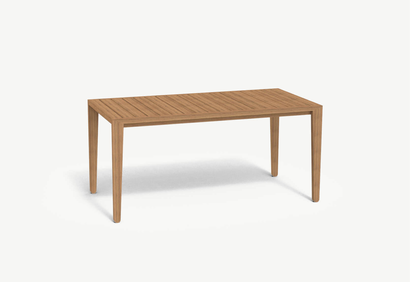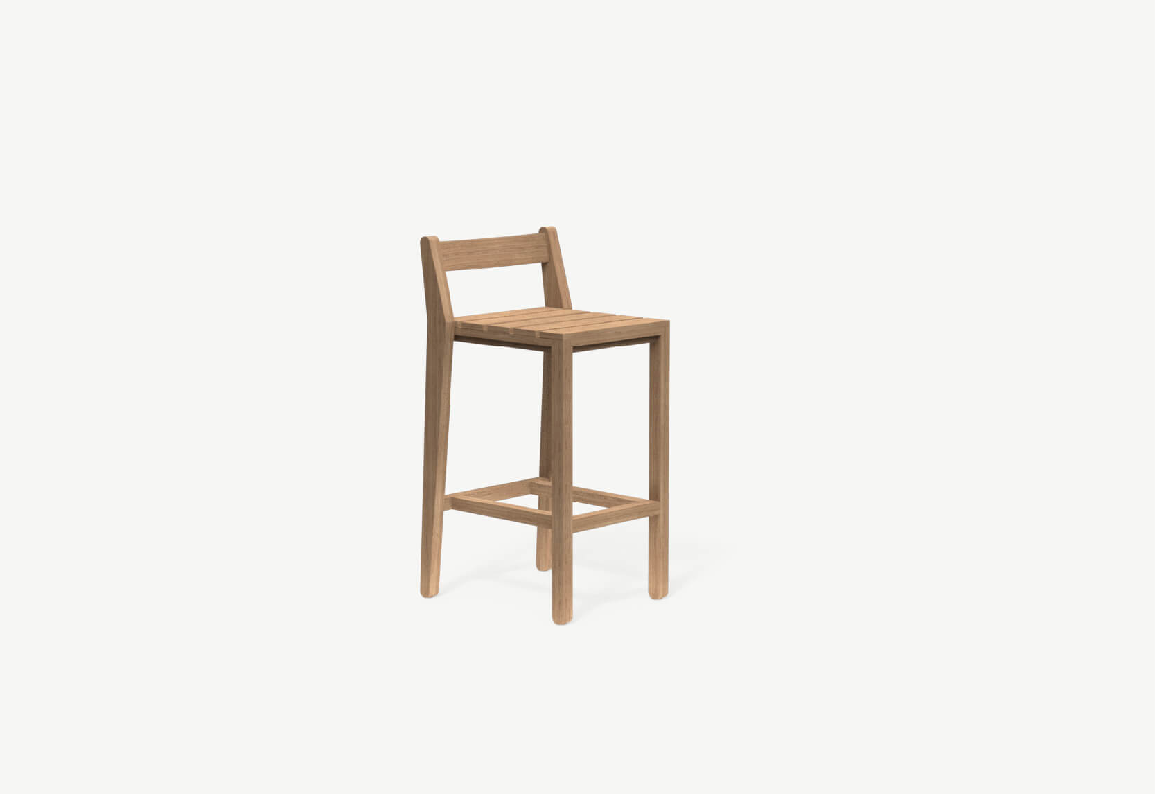 Compuesta por dos mesas, un taburete de bar y una silla apilable con reposabrazos, ZANIA está realizada en madera de Iroko, una esencia de tono cálido, duradera y extremadamente resistente a la humedad.