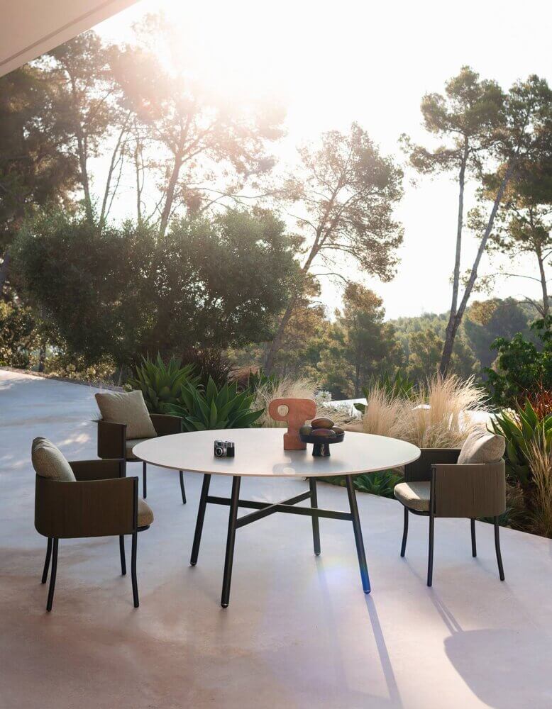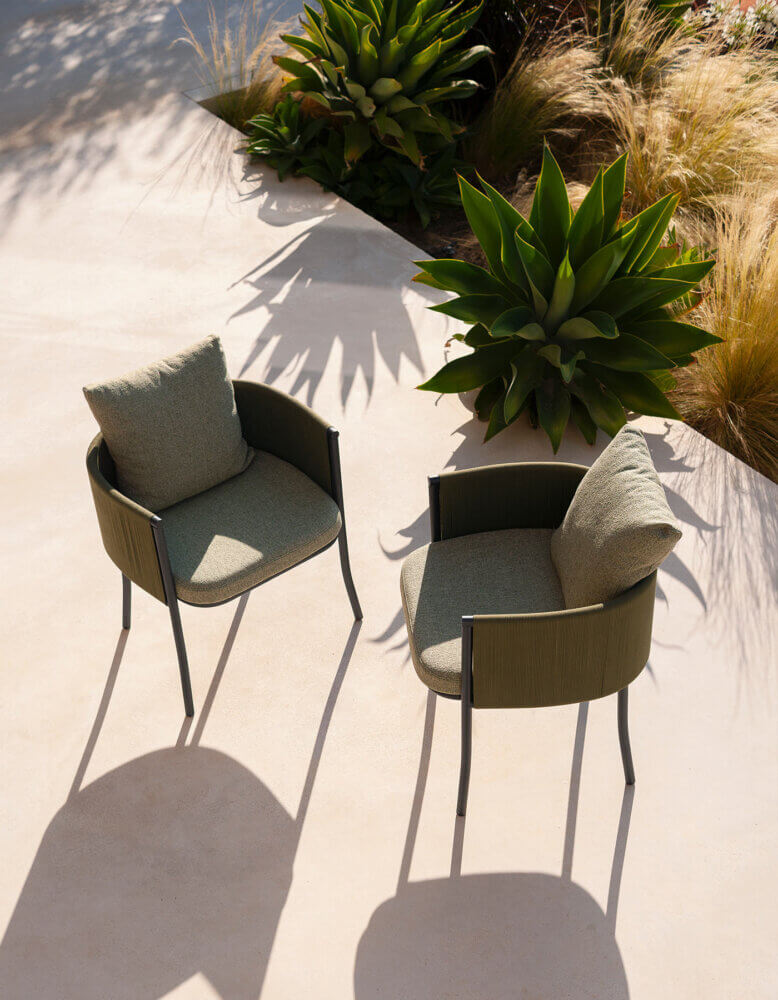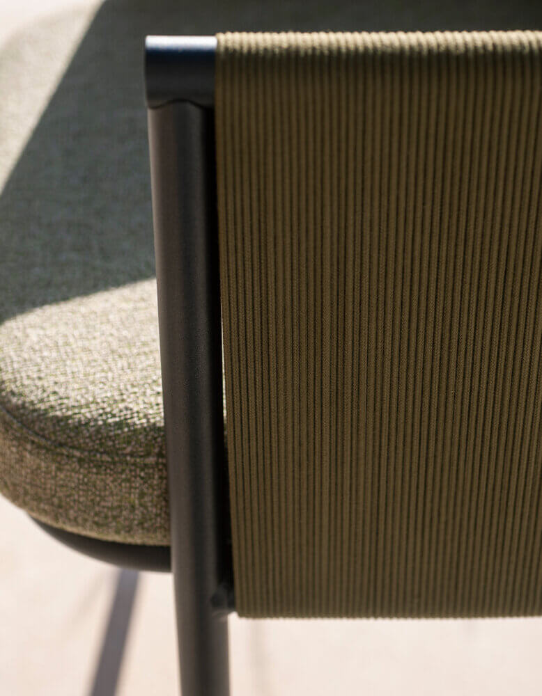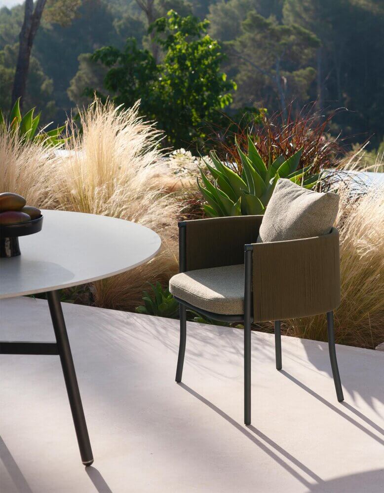 Saddle est un fauteuil de repas au design compact et parfaitement équilibré, pensé pour offrir confort et élégance dans le quotidien outdoor. La structure en aluminium peint, disponible en finitions milk et smoke, définit un profil essentiel qui met en valeur la coque tressée.