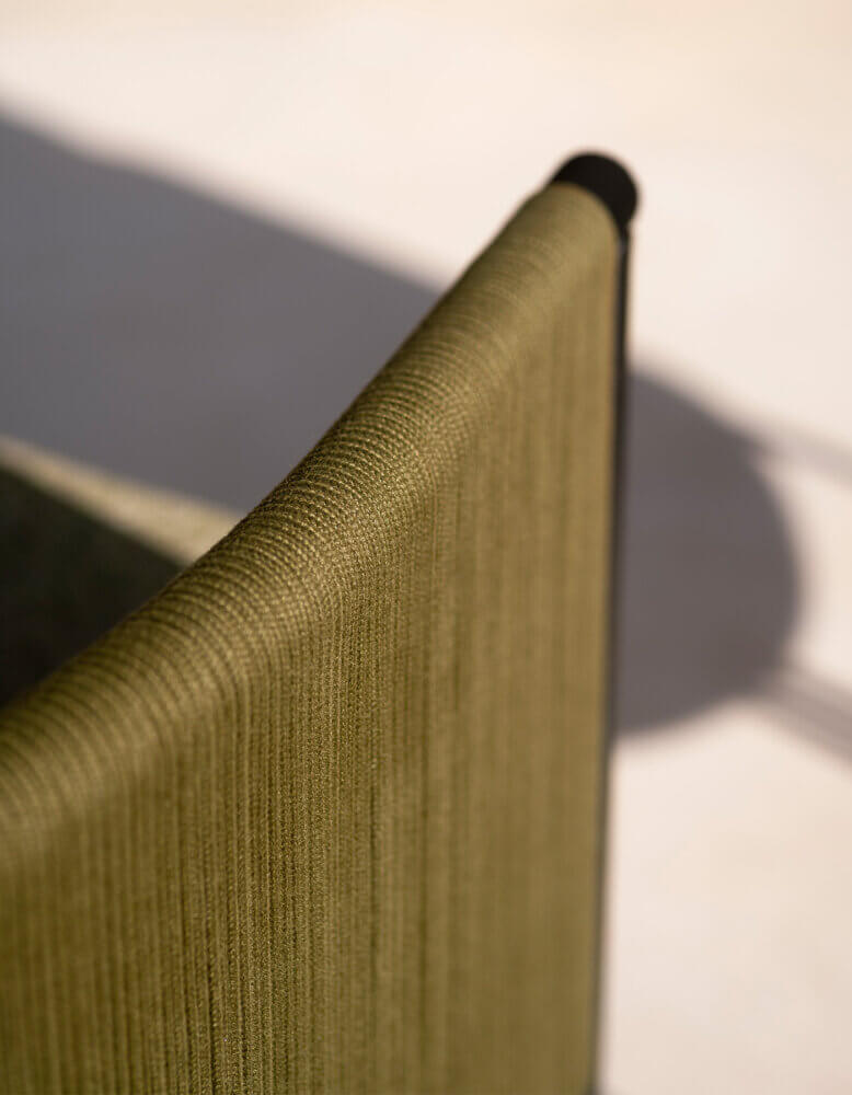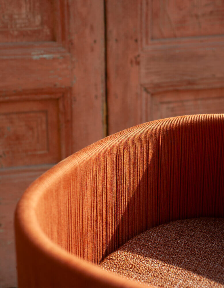 La courbe en fer à cheval qui dessine l’assise s’étend avec continuité jusqu’aux accoudoirs, créant un corps unique et harmonieux. Le dossier est entièrement cordé à la main avec une trame dense en corde, qui enveloppe et dissimule la structure interne, offrant à l’assise un aspect doux et accueillant. Le confort est encore renforcé par le coussin d’assise et celui du dossier, qui complètent l’ergonomie.