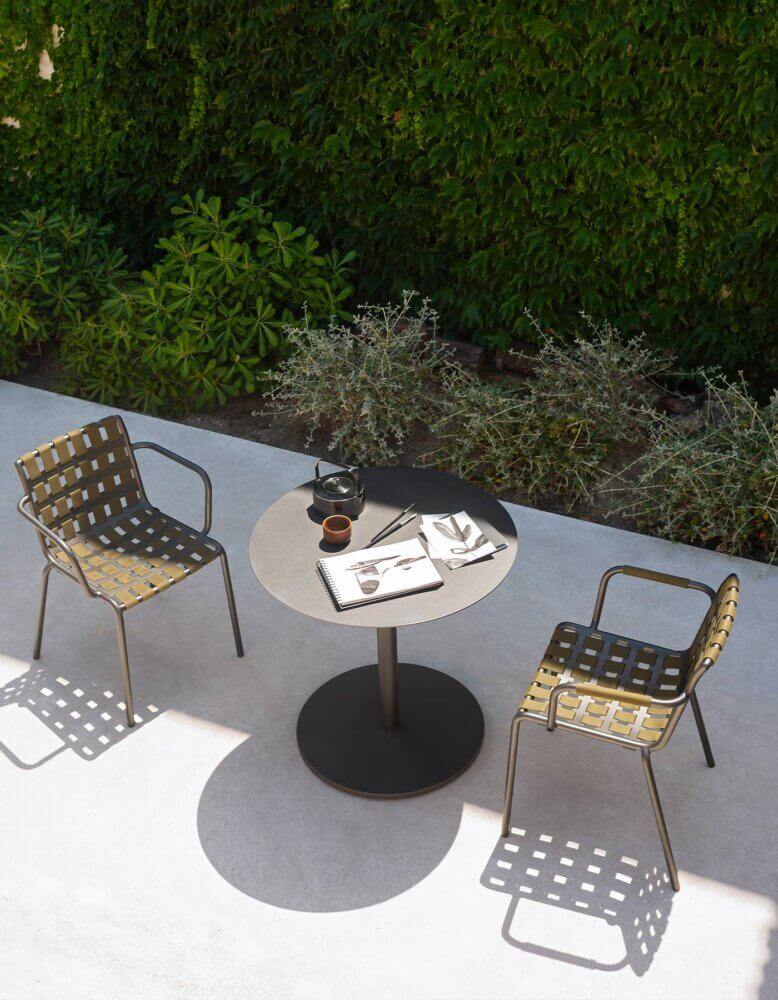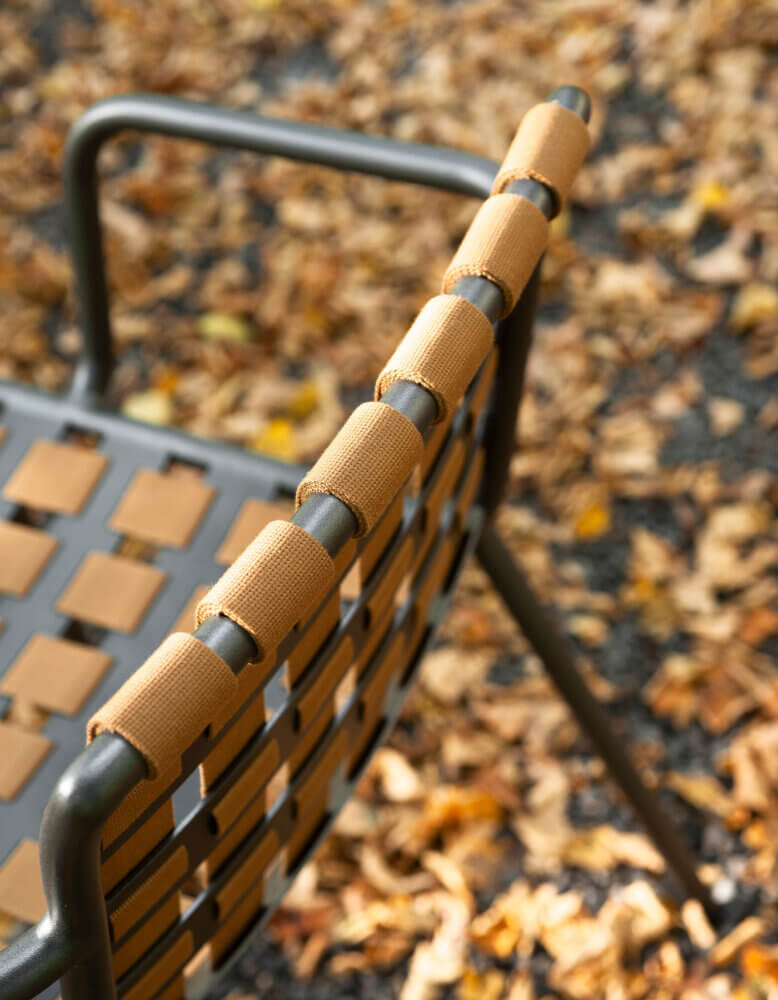 I braccioli avvolti in corda e il cuscino di seduta aggiungono comfort e calore tattile, enfatizzando il dialogo tra elementi tecnici e dettagli materici. Il risultato è una seduta dalla presenza grafica sottile, capace di arredare lo spazio outdoor con eleganza, colore e una memoria di gesti artigianali.