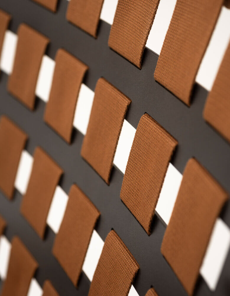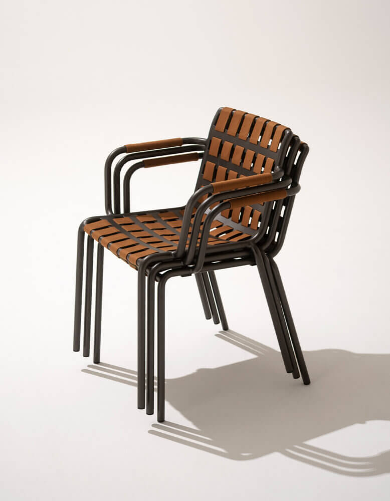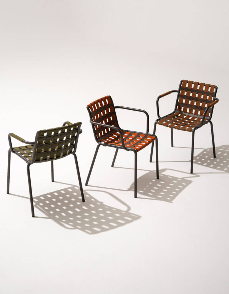 Erice è una sedia con braccioli in cui la lavorazione manuale diventa elemento decorativo e identitario. La struttura in alluminio, tagliata a laser, presenta una sequenza di aperture che funziona come un vero e proprio telaio: attraverso questi fori le cinghie vengono intrecciate, creando una trama geometrica di blocchi di colore dal forte impatto grafico.
