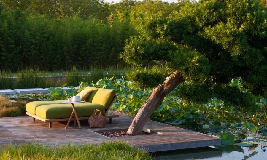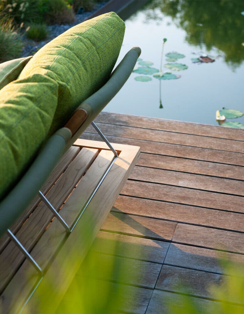 La struttura portante è il carabottino, ossia il grigliato in legno tipicamente usato nell’ambito nautico, anima di questa proposta di arredamento per il living in legno di teak naturale, che si sviluppa dal tavolino integrato alle sedute e ai moduli del divano da esterno, fino a raggiungere dimensioni più generose per la chaise longue doppia.